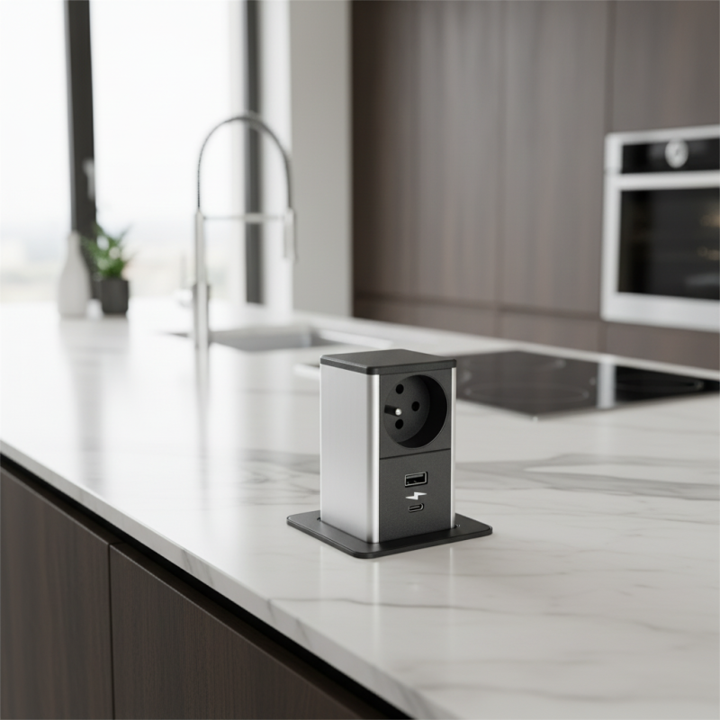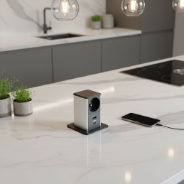 Moderní výsuvná zásuvka s francouzskou koncovkou (typ E), vhodná pro slovenský, český, francouzský i polský trh. Ideální řešení pro kuchyň, kancelář nebo pracovní stůl, kde potřebujete elegantní přístup k elektřině i USB nabíjení.